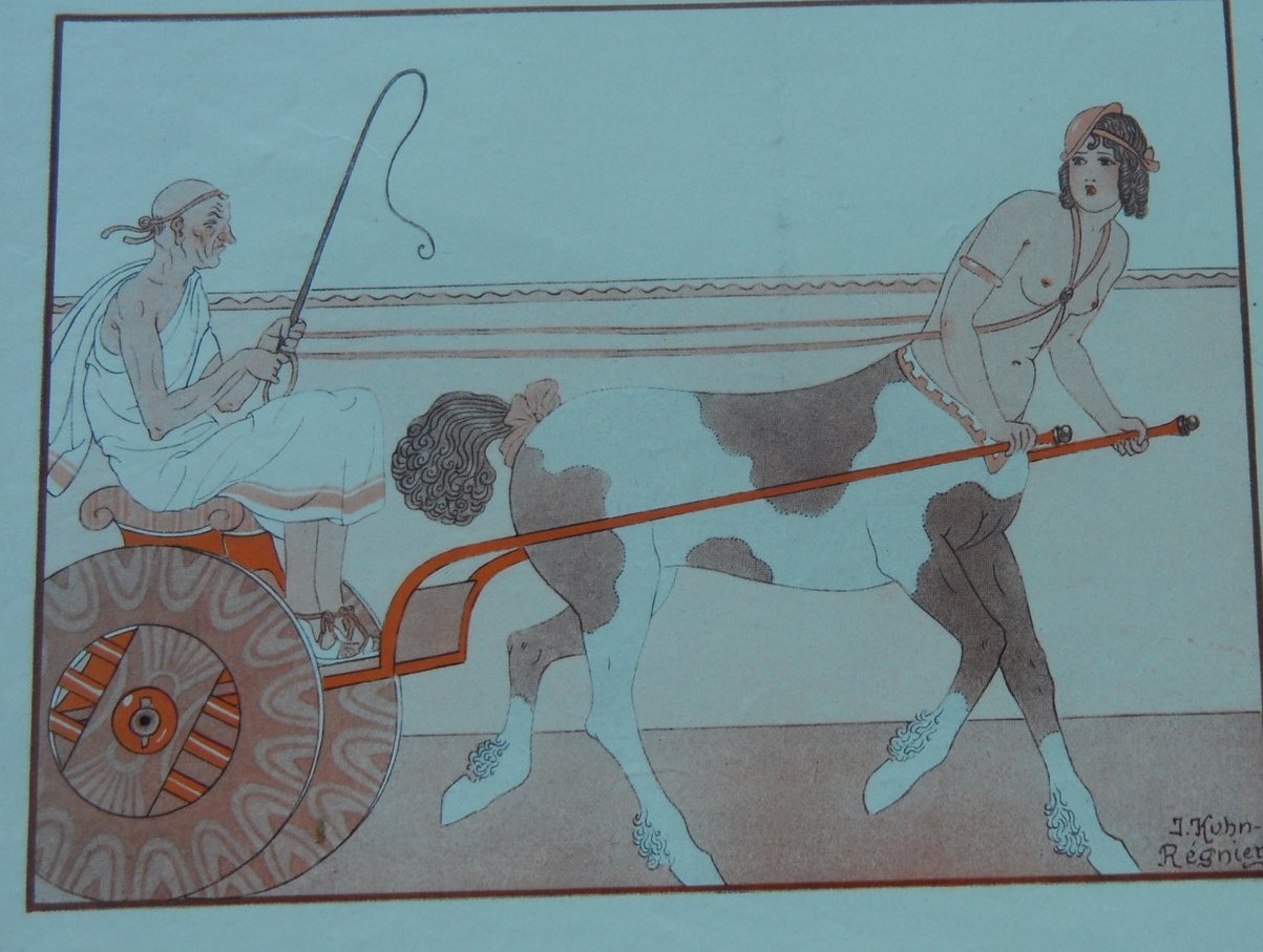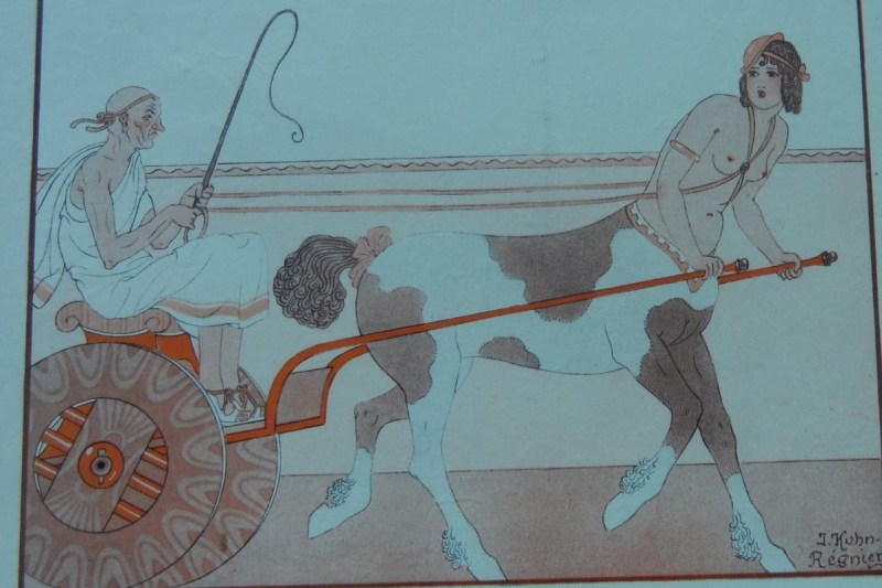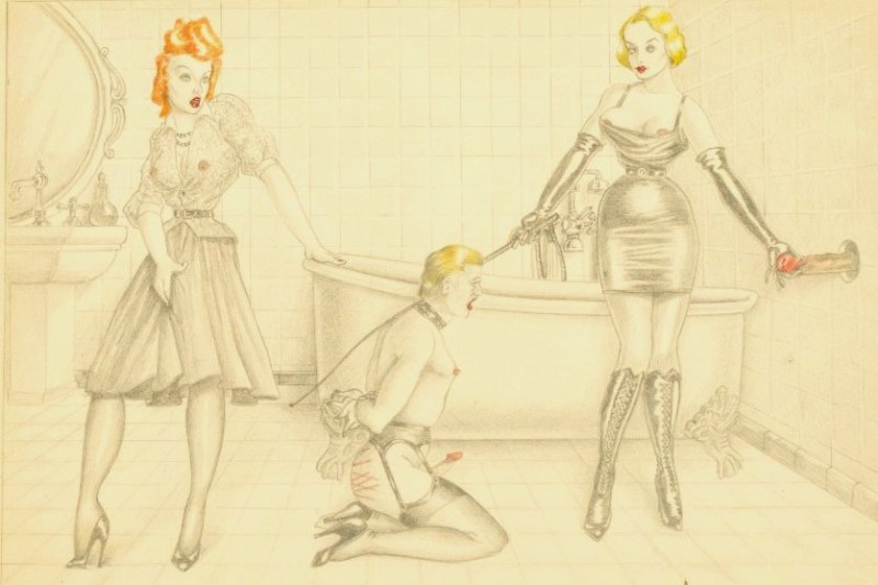 The scene is instantly recognizable to anyone familiar with 1930s Parisian livres galants. A corseted dominatrix stands like a dark Venus, one hand raised with a whip, the other resting on a curtain that frames her like a proscenium. At her feet: a kneeling man,…
