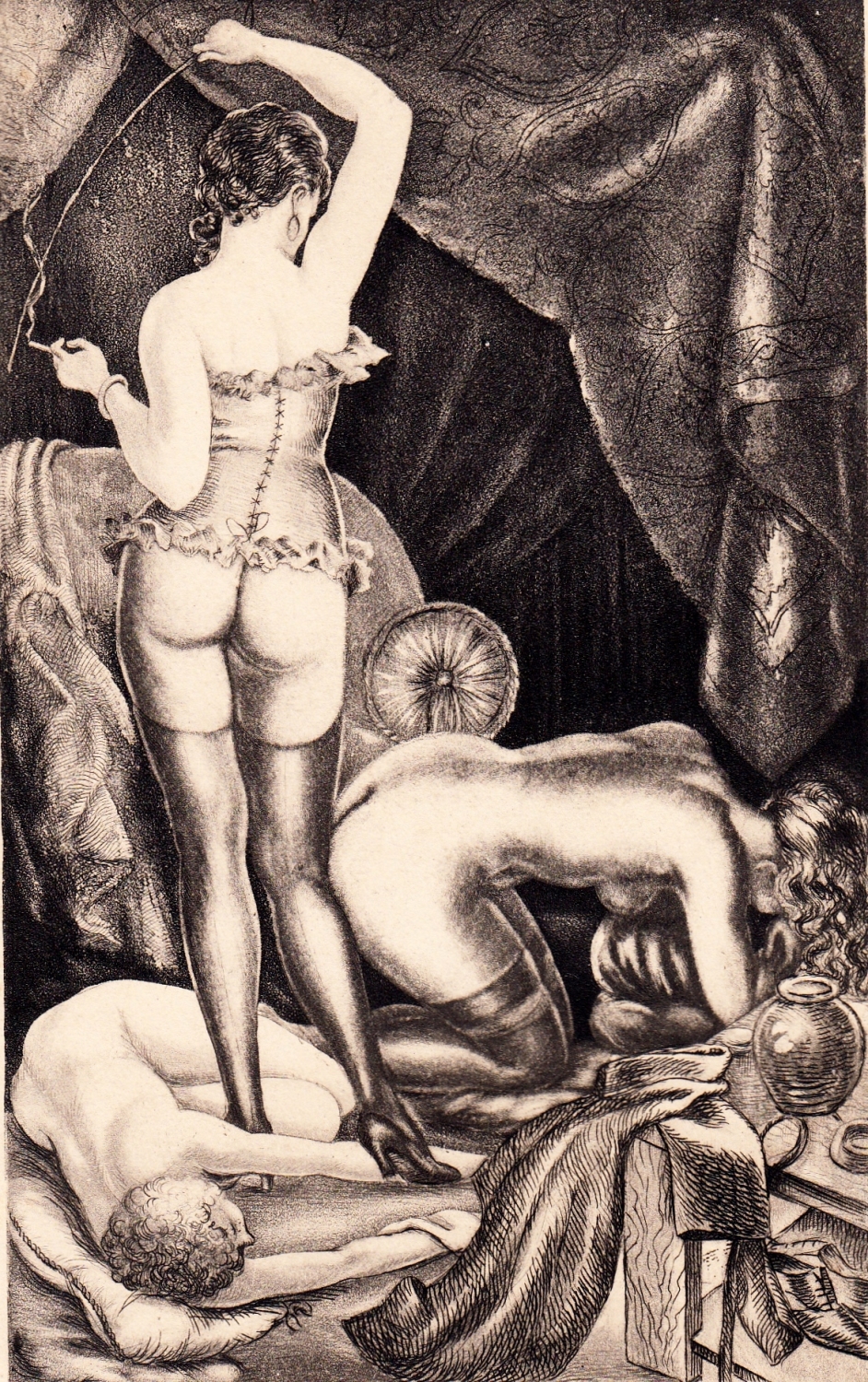 The scene is instantly recognizable to anyone familiar with 1930s Parisian livres galants. A corseted dominatrix stands like a dark Venus, one hand raised with a whip, the other resting on a curtain that frames her like a proscenium. At her feet: a kneeling man, head bowed, and a woman (the focal point) sprawled in surrender. The backdrop is heavy with symbolism: a shattered vase, a mirror reflecting nothing, drapery that swallows light. This is not mere erotica; it is theater of power.